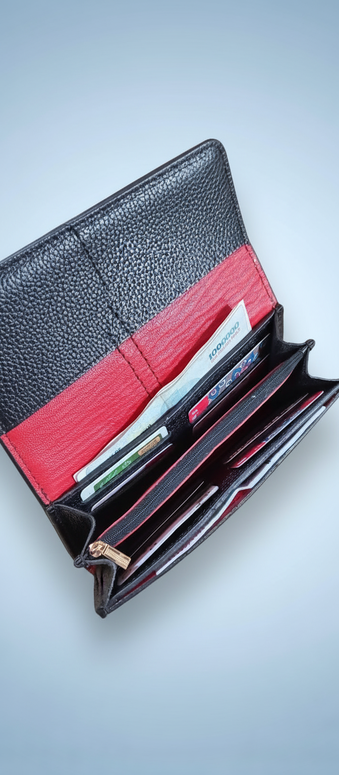 دستهبندی: زنانهکیف پول زنانه تمام چرم طبیعی- ابعاد ۱۰×۲۲ - رنگ مشکی فلوتر - دارای جای کارت،اسکناس و سکه-: ۱