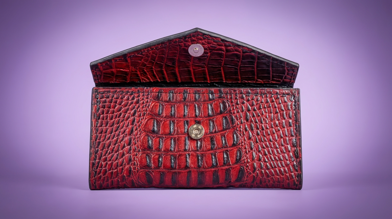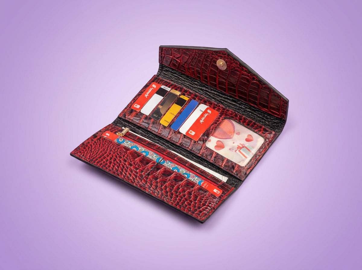 تمام چرم طبیعی- ابعاد ۱۰×۱۹ - زرشکی مشکی طرح کروکو- دارای جای کارت،اسکناس و سکه-: